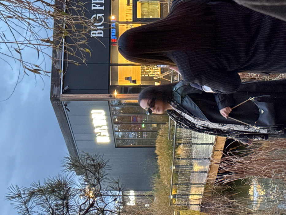 The image depicts an outdoor scene in Reichstett, France, under an overcast sky during daylight hours. Two females are present. In the mid-ground, a female with dark hair, dark rectangular sunglasses, a dark leather-like long coat, and a patterned light-colored scarf with dark logos is positioned, looking upwards and to her right. She holds a small black handbag with a gold chain strap in her left hand. To her right, seen from behind, a second female with long, straight dark hair is holding a smartphone horizontally with both hands, actively photographing the first individual. The background features modern commercial architecture. A prominent dark-colored building with large glass windows displays the illuminated white text "BIG BENNO" on its left facade and partial illuminated text "BIG F..." (likely "BIG FERNAND") on its right. Interior lights, emitting a yellow glow, are visible through the windows of this building. Another partially visible sign displaying "Leali" is present further to the left. A dark-railed bridge with a wooden deck spans a body of water behind the posing subject. The surrounding environment includes dry, reedy grasses in the foreground, yellowish ornamental grasses on the far bank, and branches from coniferous trees in the upper left, along with leafless deciduous branches in the upper right. The body of water beneath the bridge is dark with subtle reflections.