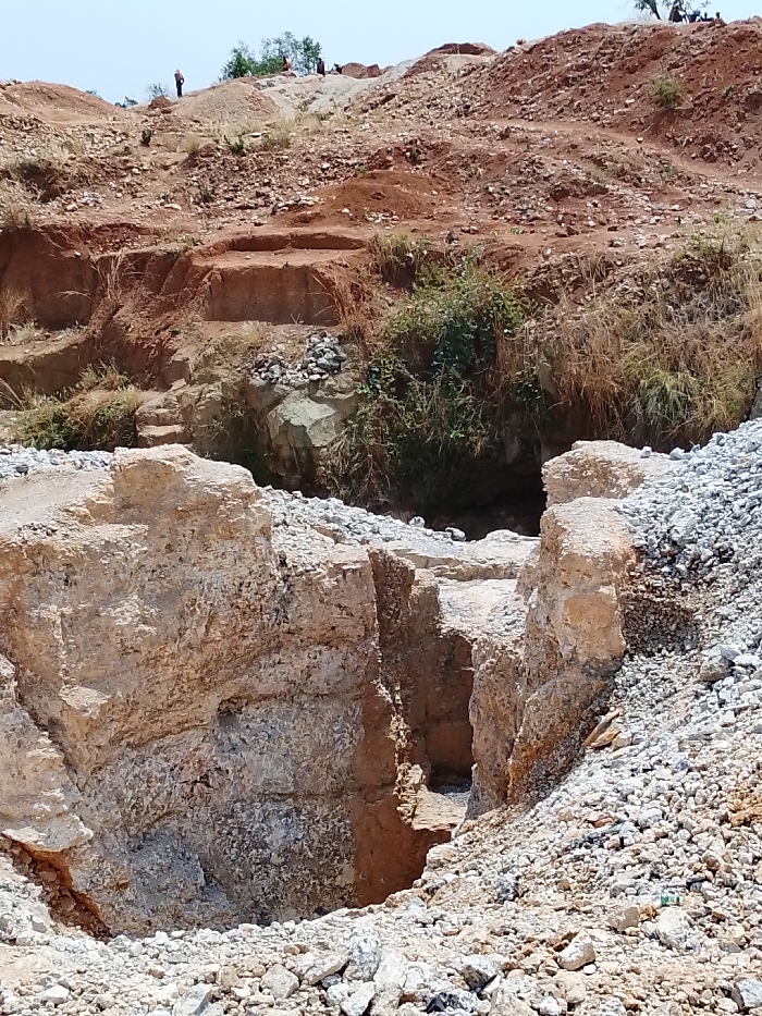 The image depicts a rocky, arid landscape, possibly a quarry or excavation site