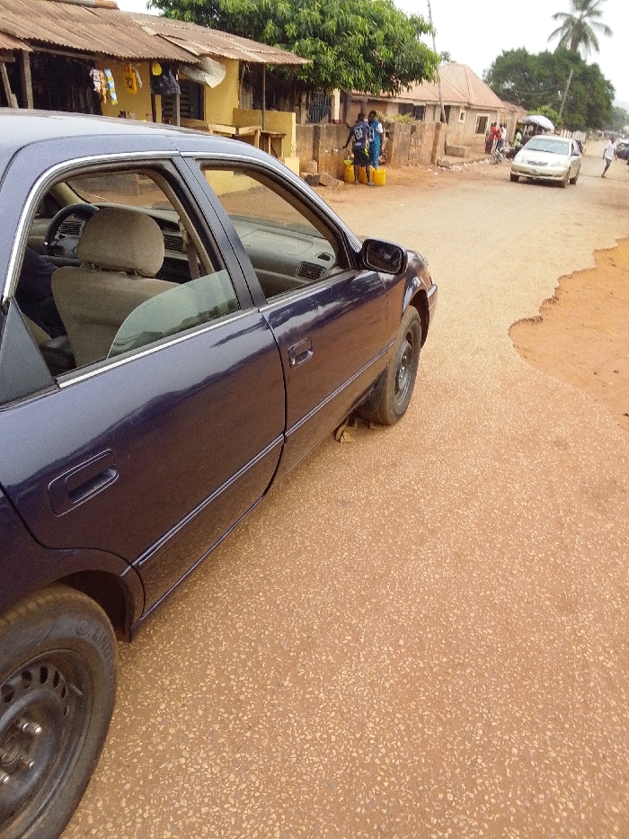 The scene depicts a street in Ankpa, Nigeria. In the immediate foreground, a dark blue sedan, appearing to be a Toyota Camry, is parked on a light brown, aggregate-paved road. The vehicle is oriented with its driver's side facing the viewer; its front and rear driver-side windows are open, revealing beige cloth seats and a gray dashboard. The rear driver-side wheel lacks a hubcap. To the right, the paved road transitions into an uneven, reddish-brown dirt shoulder. On the left side of the street, a row of single-story buildings with rusted corrugated metal roofs is visible. One building exhibits a faded yellow facade with clothes and other items hanging outside. Two adult males are positioned near this building, alongside several yellow jerrycans, suggesting a water collection point or a small commercial setup. One individual is wearing a blue jersey with the number "24" on the back. Further down the road, a white sedan (possibly a Toyota Corolla) is approaching, and multiple pedestrians are visible on the roadside. The background includes various green trees and distant structures. A single palm tree is visible on the far right horizon. The sky is overcast.