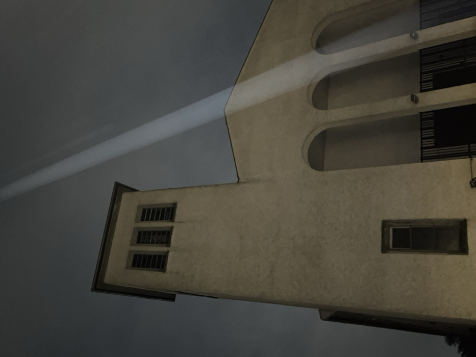 A low-angle shot depicts a building illuminated by a bright, linear light source against a dark sky. The building's facade features a series of arched openings and barred windows. A single, small window is visible on the lower part of the wall. The exterior of the building appears to have a textured surface. The light source creates a distinct, elongated beam across the image, contrasting sharply with the dim surroundings.
