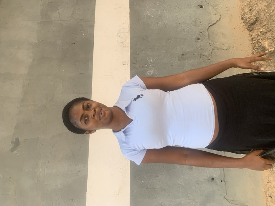 A woman is centered in a photo, standing against a cement and white striped wall. She is wearing a light blue polo shirt with a dark logo and a black skirt. Her hair is short. The background to the right shows rough, sandy ground. Her right arm is outstretched to the right.