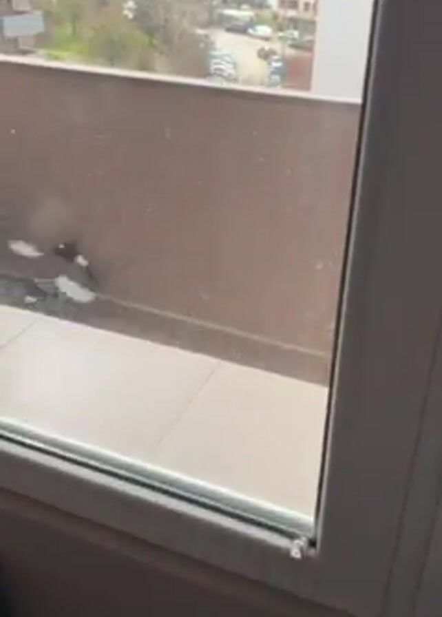 A person is standing inside looking out a window onto a balcony. Two birds, seemingly magpies, fly into the balcony area. The balcony is made of brown tile, with a metal bowl on the ground. Beyond the balcony is a cityscape with buildings and a park. In the distance, mountains are visible. The sky is overcast.