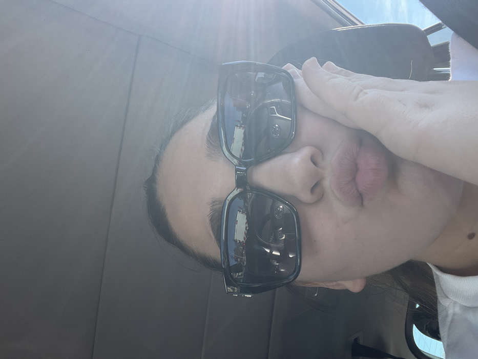 A female subject is depicted from the chest up inside a vehicle in Souffelweyersheim, France. She wears dark, square-framed sunglasses and a white garment. Her lips are pursed in a pout, and her right hand lightly touches her right cheek. A small, dark mole is visible on her lower neck. The vehicle's grey headliner is visible in the upper portion of the frame. Reflections in the sunglass lenses show an outdoor environment with a road or parking lot, other vehicles, and distinctive red and white striped barriers, indicative of a construction zone or traffic control. Bright sunlight is present, creating a lens flare on the right side of the image. The subject appears to be performing the action of taking a selfie.