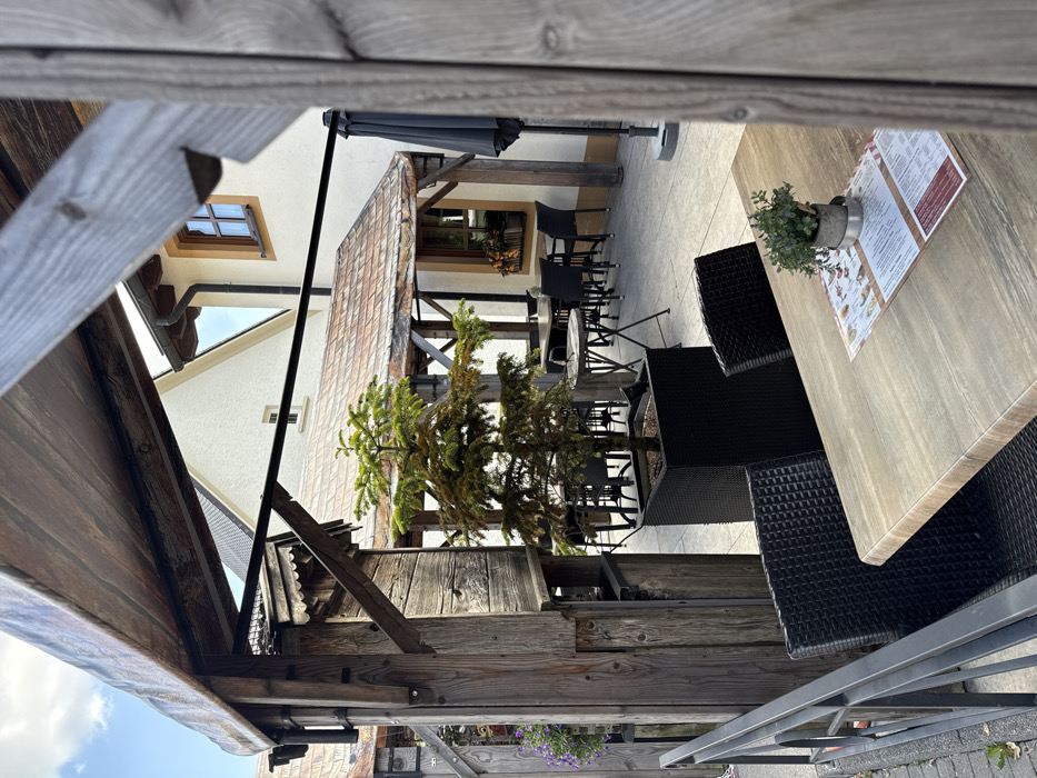 This image displays an outdoor dining patio in Vianden, Luxembourg