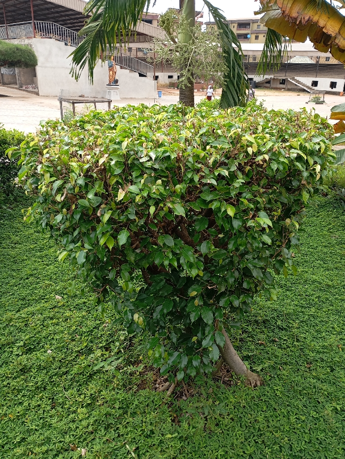 This image depicts a landscaped institutional compound in Onitsha, Nigeria. In the foreground, a dense, dark green, trimmed evergreen shrub, approximately 1.5 meters tall, is centered, rooted in a uniform groundcover of smaller green plants. The background features a paved area flanked by substantial concrete structures. To the left, a multi-story building with a dark sloped roof is visible, fronted by an external staircase with metal railings. A religious statue of a robed figure stands on a white pedestal near this building. To the right, a large, tiered concrete structure, possibly stadium seating, extends into the distance. Several palm trees and other deciduous trees are interspersed throughout the background. Two individuals are present in the mid-distance: one male figure in light-colored attire walks rightward across the paved area, and another is partially obscured behind vegetation. A light-blue industrial waste bin is visible in the far background. The sky is overcast.