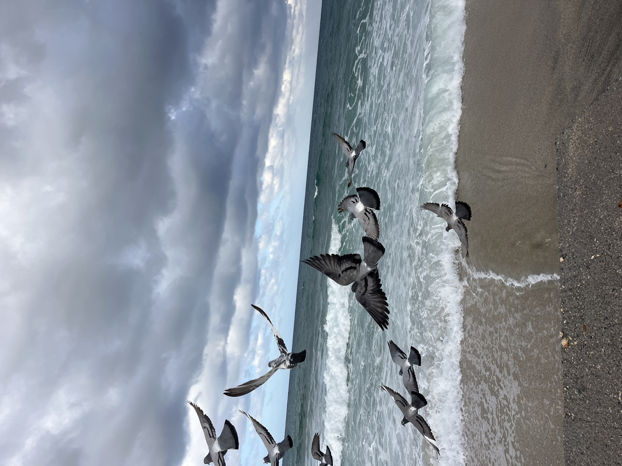 The image depicts a beach scene in Alanya, Turkey. The foreground features a flock of pigeons in flight, wings outstretched. The background showcases the sea meeting the shore. White foamy waves crash onto a sandy beach. Beyond the beach, the image continues with a strip of dark, textured asphalt. The sky is overcast with heavy, grey clouds.
