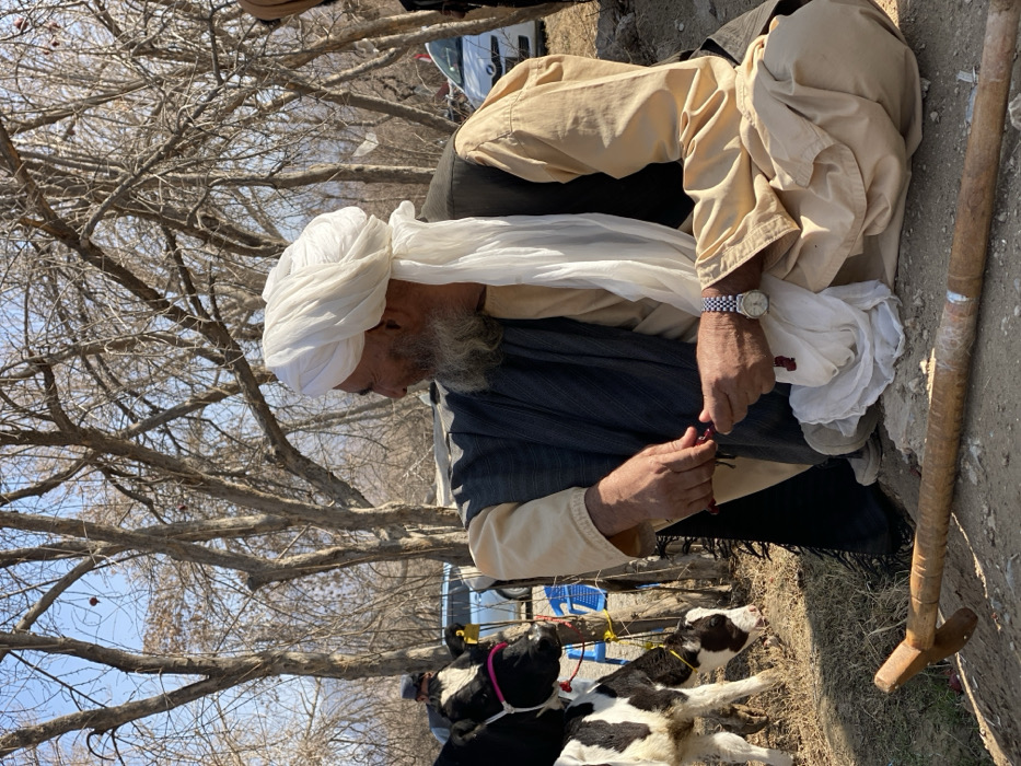 An older man in traditional clothing, including a white turban, sits outside by bare trees. He wears a watch and manipulates prayer beads. Two black and white calves stand nearby, each with a colorful rope around their necks. The ground is dirt, and a wooden tool rests beside the man. The composition is taken from a low angle.