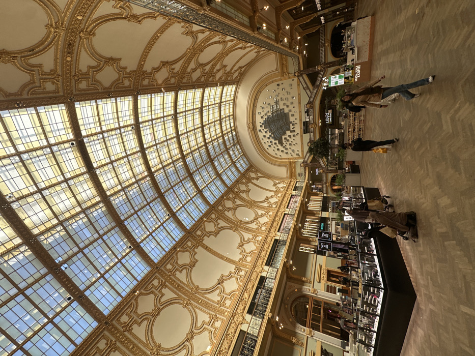 The image displays the interior of a grand, multi-level public space, identified as a shopping gallery or concourse within the Antwerpen-Centraal railway station in Antwerp, Belgium. The dominant overhead feature is an expansive, arched glass roof composed of segmented panels, both clear and amber-tinted, supported by a highly ornate, gilded structural framework. The cream-colored walls below the roof are extensively decorated with gilded rococo-style molding. The ground floor features a herringbone-patterned wooden floor. On the left side of the frame, multiple black, illuminated display cases showcase small merchandise, likely jewelry or accessories. Along the lower levels, various retail storefronts are visible, with signage including "TWICE AS NICE," "Snooze," and "Lloyd." At the far end of the hall, symmetrical grand staircases ascend to upper levels, flanking a large, arched architectural recess that houses an abstract wall art installation composed of numerous reflective square elements arranged in a dynamic, scattered pattern. Potted trees and plants are positioned throughout the space, with one notable tree near the center. Approximately 10-15 individuals are present on the ground floor. In the foreground, two individuals walk from left to right: one wears a light brown jacket, blue jeans, and light shoes; the other, slightly behind, wears a dark top and carries a yellow bag. Near the display cases on the left, an individual wearing a brown head covering pushes a brown pram. Other individuals are observed walking or standing further within the hall. The space is illuminated by a combination of natural light filtered through the glass roof and supplementary artificial lighting.