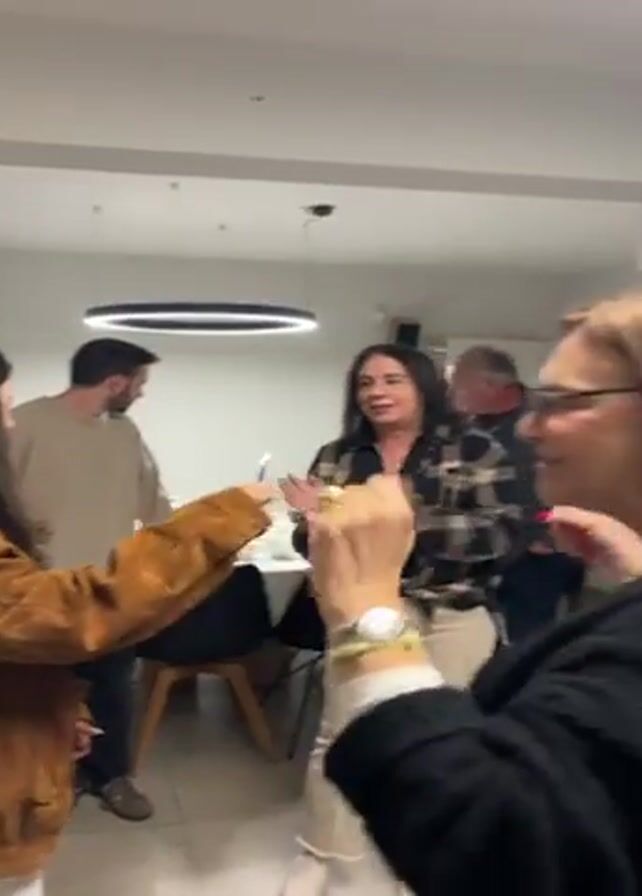 A group of five adults, presumably family, stand in a dining room and celebrate. The camera is held from the perspective of an adult female, wearing a brown jacket, standing to the left of a woman wearing a plaid shirt and beige pants. The woman in the plaid shirt, is smiling and moving her hands and arms and is likely singing along to celebratory music. Behind her, to the left, is a man wearing a light beige long-sleeve shirt and dark pants. Behind the woman in the plaid shirt, to the right, are two male figures, one wearing black. There is a white oval table in the middle of the room with various items, including what appears to be prepared food, set up on it. The room is well-lit. A circular light hangs from the ceiling above the table. There is wood paneling in the far corner.