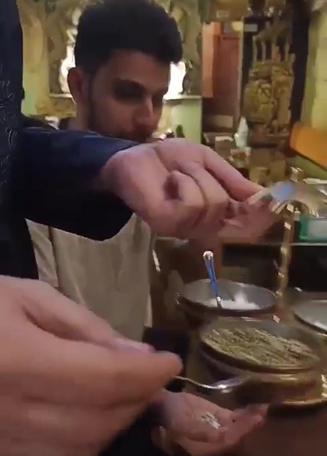 Three men are sitting at a wooden table in a restaurant, sharing a meal. The table is set with various small dishes, cups, spoons, and glasses. A silver tiered platter with small bowls containing seeds, sugar, and other items is on the table. One of the men is using a small spoon to transfer items from the platter into his hand. Another man is looking at the camera with a concerned expression. The restaurant has dark wooden furniture, green and yellow patterned walls, and decorative objects. The background music is lively and upbeat.