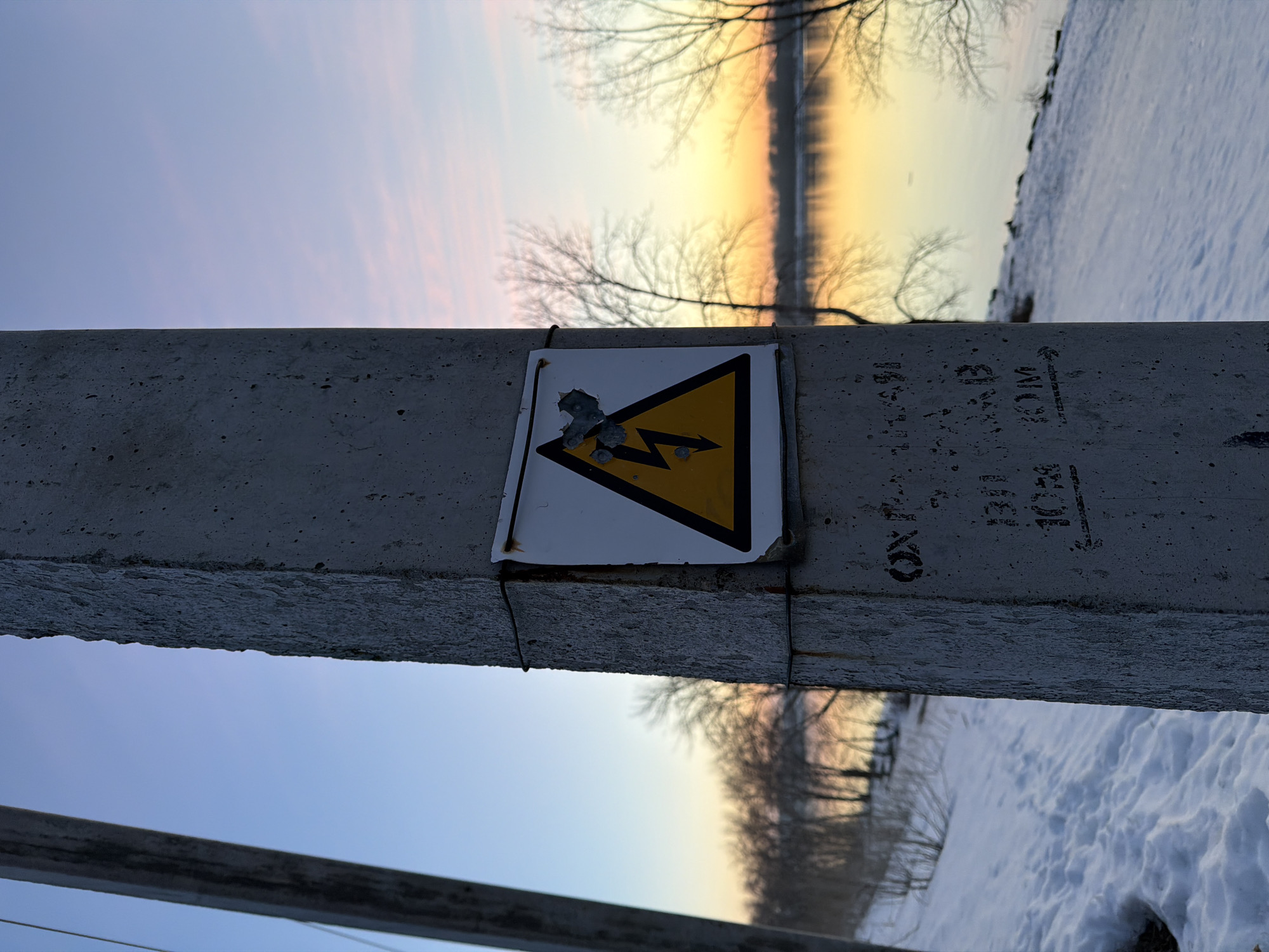 A close-up shows a concrete pillar in Chaikovsky, Russia. Affixed to the pillar is a damaged, yellow and black high voltage warning sign. The sign has multiple holes, possibly from impact. Thin wires secure the sign to the pillar. In the background, there is snow-covered ground and a body of water with a sunset or sunrise sky reflected on the surface. Bare trees line the horizon. Cyrillic characters are faintly visible on the pillar.