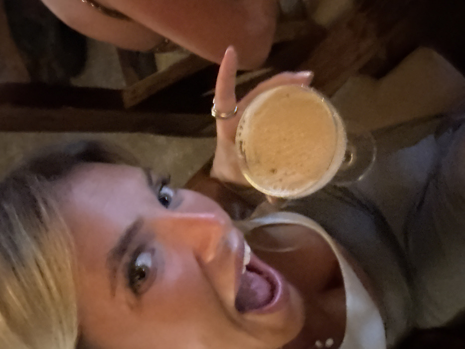 - "A close-up, eye-level selfie captures a blonde woman holding a stemmed cocktail glass with a frothy, light-tan beverage in a dimly lit indoor establishment, likely a bar or restaurant in Uluwatu, Indonesia" by FM-ohidB3, licensed under CC BY 4.0