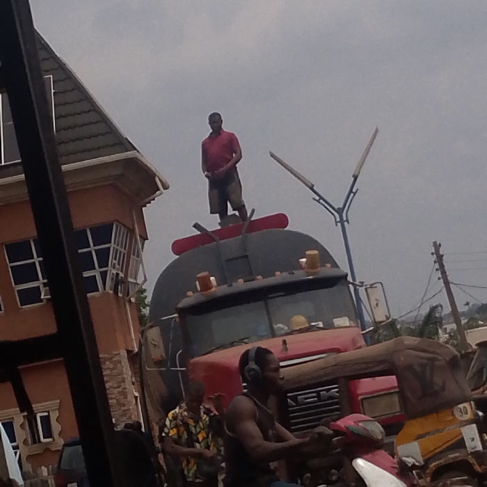 In Ukwu-Abwa, Nigeria, an outdoor scene captures an overcast sky over a street with multiple individuals and vehicles. A man, dressed in a red short-sleeved shirt and light shorts, stands erect atop the dark grey tank body of a red-cabbed truck. His hands are clasped in front of him. Two amber warning lights are visible on the truck's tank, and a red curved structure is beneath the man's feet. The truck's grille partially displays the letters "NEK." In the lower foreground, a dark-skinned man wearing a dark sleeveless top and grey over-ear headphones sits on a pink and white scooter-style motorcycle, holding the handlebars. To his left, another man with dark skin wears a multi-colored patterned short-sleeved shirt. A yellow and black tricycle, marked with "30," is partially visible behind the motorcyclist. To the far left, a multi-story building with a reddish-brown facade, white-framed windows, and a dark tiled roof stands prominently. A grey, Y-shaped streetlight with two fixtures is visible to the right of the truck.