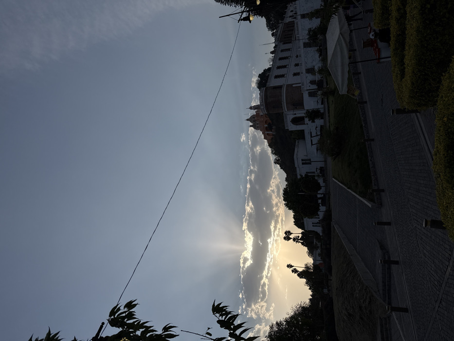A landscape view features a bright sky with sunbeams emerging from behind a tall cloud formation. Below the clouds are palm trees and other vegetation. A paved walkway with bollards and manicured hedges runs parallel to the vegetation. On a hill in the distance, a building complex with white walls and a red-domed church sits atop the hill. A power line cuts across the sky.