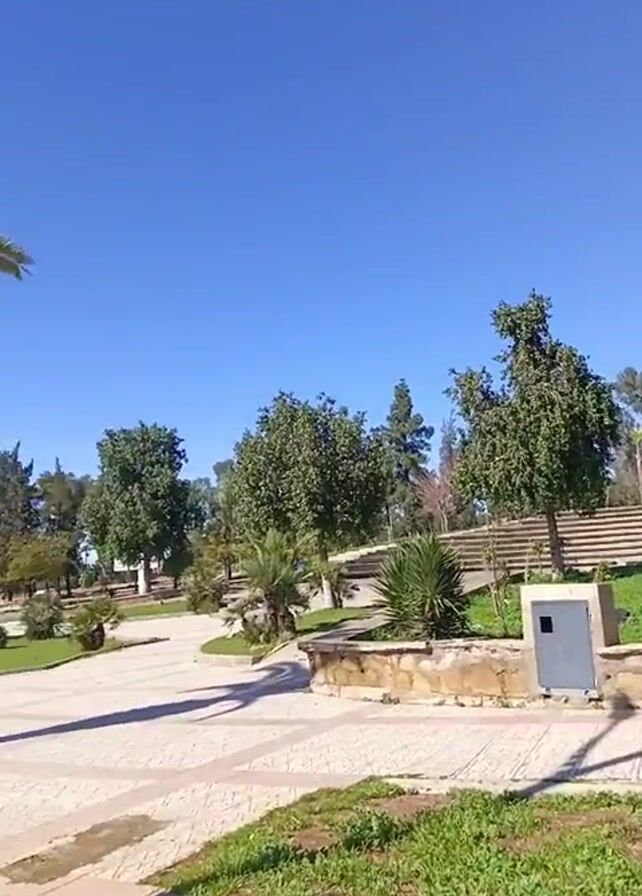 park area adjacent to a city street on a sunny day. The park has trees, bushes, and a paved area with a decorative pattern. There is a low stone wall with some grass behind it, and steps leading up to a higher level. Palm trees are interspersed among other trees. The street is visible with traffic, a crosswalk, and a traffic light. A billboard is also visible in the distance, showing the city skyline. The sky is clear and blue.