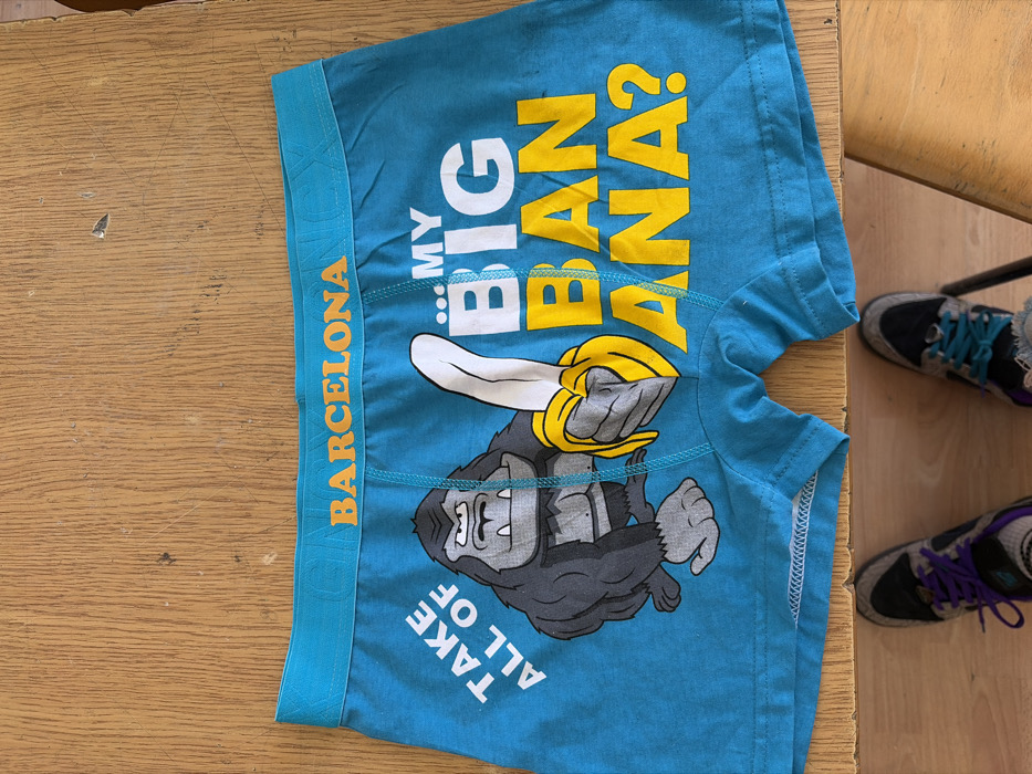 The image displays a pair of teal-blue men's boxer briefs laid flat on a light-colored wooden surface, likely a table or floor. The boxer briefs feature a prominent design: a cartoon gorilla in grey with black fur accents, holding a partially peeled banana with a white fruit and yellow peel. Text accompanies the illustration; on the left, oriented vertically, "TAKE ALL OF" is printed in white capital letters. To the right of the gorilla, text reads "...MY BIG BAN ANA?" with "MY BIG" in white and "BAN ANA?" in yellow capital letters, humorously incorporating the banana. The waistband of the boxer briefs is teal blue, with the word "BARCELONA" printed in orange capital letters across the front. In the lower portion of the frame, the feet of an individual are visible, clad in sneakers. The left shoe is dark with purple laces and white soles, while the right shoe is dark with teal laces and white soles. White socks are partially visible, and the cuff of blue denim jeans is seen on the right leg. The wooden surface exhibits visible grain and minor scuff marks. The specific location within the city of Sofia, Bulgaria, cannot be determined from the visual information present in the image.