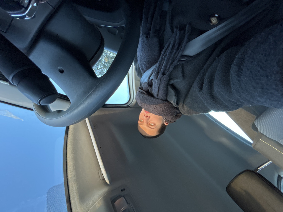 A person is seated in a car, wearing a dark coat and scarf, with a seatbelt fastened. The steering wheel is prominently visible, positioned to the left. The sky and some trees can be seen through the windshield. The interior of the car includes a light-colored roof and dark gray upholstery. The person is looking toward the camera.