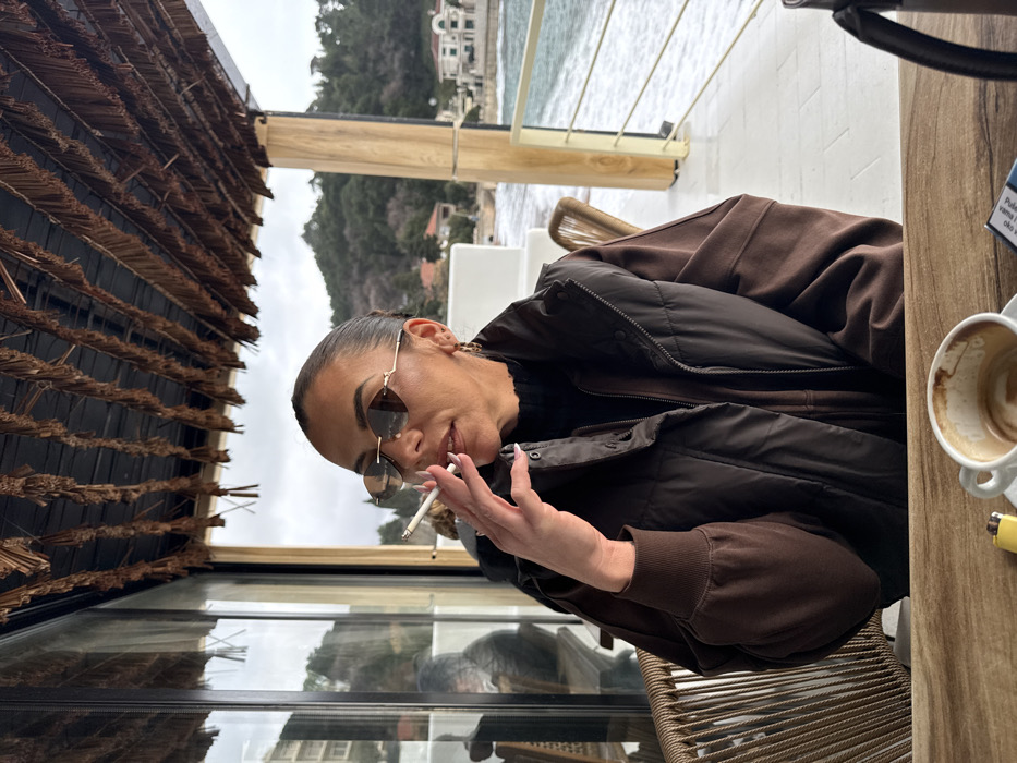 An adult female is seated at a wooden table on an outdoor terrace in Petrovac na Moru, Montenegro