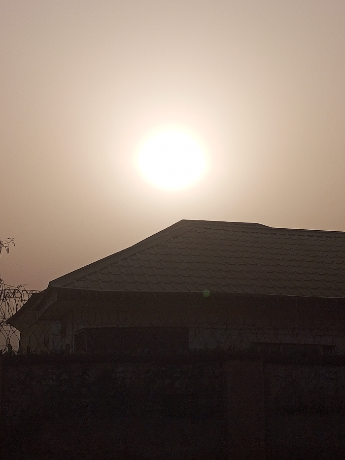 A sun-drenched scene with a luminous orb dominating the hazy sky above a dark rooftop