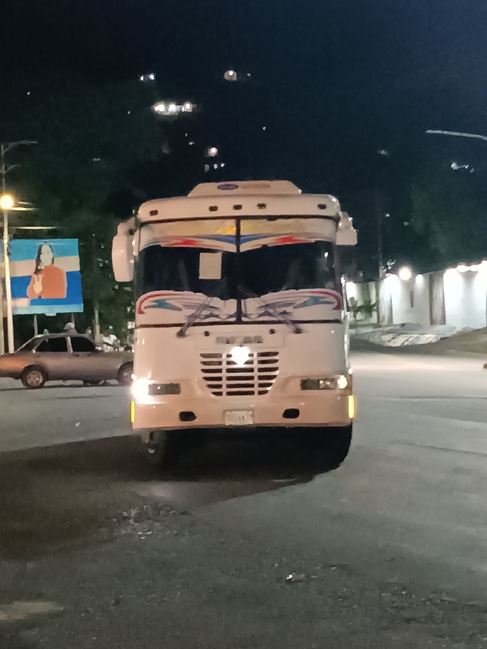 At night, a white bus with decorations on its front stands on a street. Its headlights are on. A sign depicting a person is visible behind the bus on the left. A light-colored car is parked next to the sign. In the background, there is a tree line, houses, and street lights.