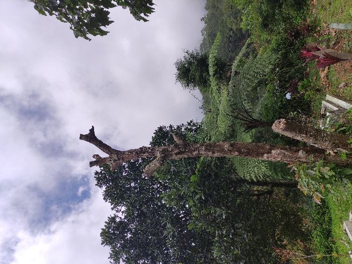 A vertical shot showcasing a lush, natural environment. A prominent, leafless tree trunk dominates the foreground, its branches extending against a backdrop of a cloudy sky. Green trees and foliage fill the right side, stretching into the distance towards a misty hill. The color palette is predominantly green, brown, and gray, evoking a sense of tranquility. The overall composition emphasizes nature's beauty and a serene atmosphere.