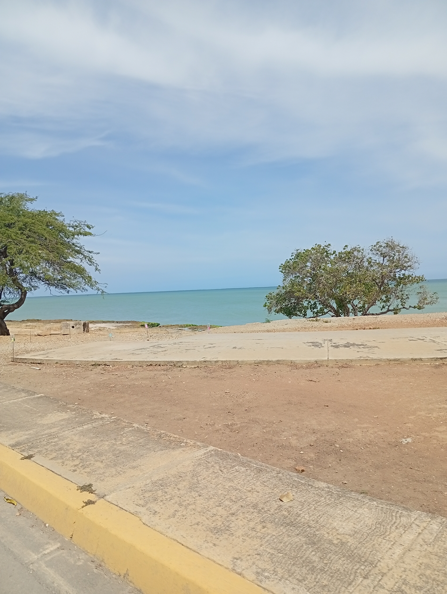 The image displays a coastal scene in La Guardia, Venezuela, under a clear sky with scattered white clouds. The upper portion reveals a light blue sky transitioning into a calm, greenish-blue body of water, likely the ocean, which extends across the horizon line. In the foreground, a yellow-painted curb runs diagonally across the lower left, separating a textured grey concrete surface from a wide expanse of dry, light brown, and reddish-brown dirt or gravel. Closer to the water, a flatter concrete or paved area is visible, with some irregular concrete structures or debris on its left side. On the right side of this elevated area, several small, brightly colored markers or flags are stuck into the ground. Two large trees dominate the terrestrial landscape: one on the far left with a dark, gnarled trunk and dense green foliage, and another on the right with a more sprawling canopy of lighter green leaves, both situated near the water's edge. The scene is devoid of human or animal presence.