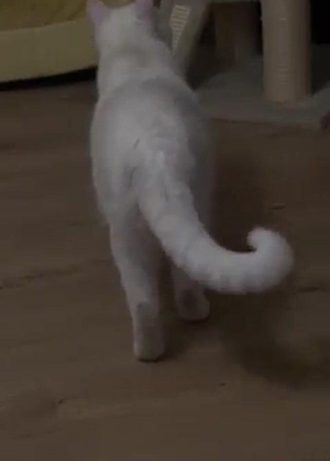 - "A white cat with a curled tail walks away from the camera across a wood floor" by FM-PFEbq2, licensed under CC BY 4.0