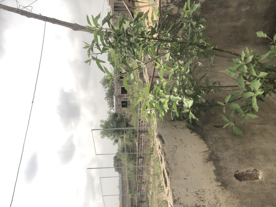 This image captures an outdoor, undeveloped urban scene in Ogbomosho, Nigeria, under a cloudy sky. In the foreground, a weathered, light-colored concrete wall features dark staining and two irregular holes. Growing adjacent to the wall is a green, multi-stemmed plant with numerous leaves, consistent with *Vernonia amygdalina*. A rough-hewn wooden pole with attached thin wires is visible on the far right. Beyond the concrete wall, a flat, sparsely vegetated expanse contains several metal rectangular frame structures. The background reveals multiple uncompleted or derelict concrete block buildings with open window apertures, interspersed with trees and additional foliage. No individuals or active scenes are present.