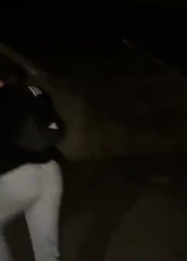 A person wearing white pants and a dark jacket is running in a dark, concrete area