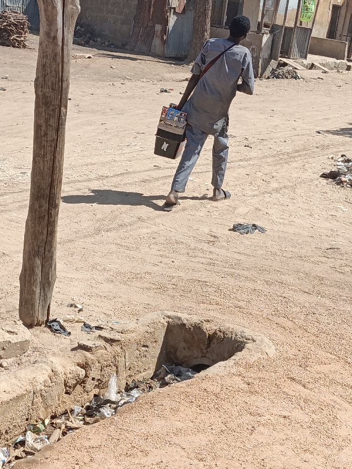 An outdoor scene in Zango, Nigeria, depicts a male individual, viewed from the rear, walking on a light brown dirt path. He wears a grey long-sleeved tunic, grey trousers, and dark open-toed sandals. A dark shoulder bag with a red strap is slung over his right shoulder, incorporating a carrier holding various small packaged items, identifiable by a white 'N' on a black panel. To the left, a weathered wooden post stands vertically. In the foreground, an earthen drainage ditch runs horizontally, filled with plastic bags, wrappers, and other discarded refuse. Additional debris, including a dark textile item, is scattered on the dirt path. The background features multiple dilapidated structures, primarily constructed from corrugated metal, some showing rust. A green sign with partial white text is visible on a structure in the upper right. The scene is brightly lit by daylight, casting distinct shadows.