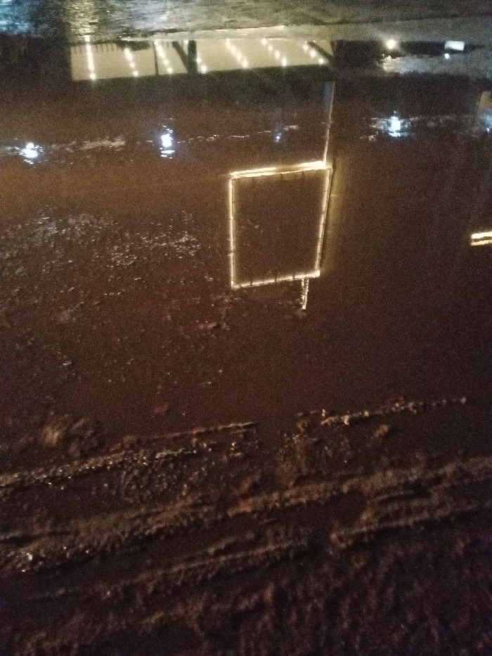 An aerial shot at night reveals a flooded area with building reflections. A prominent, illuminated square structure stands in the water. The surface has a rippled texture, suggesting light rain or moving water. The foreground shows a rough, uneven ground surface. The overall atmosphere is dark and wet.