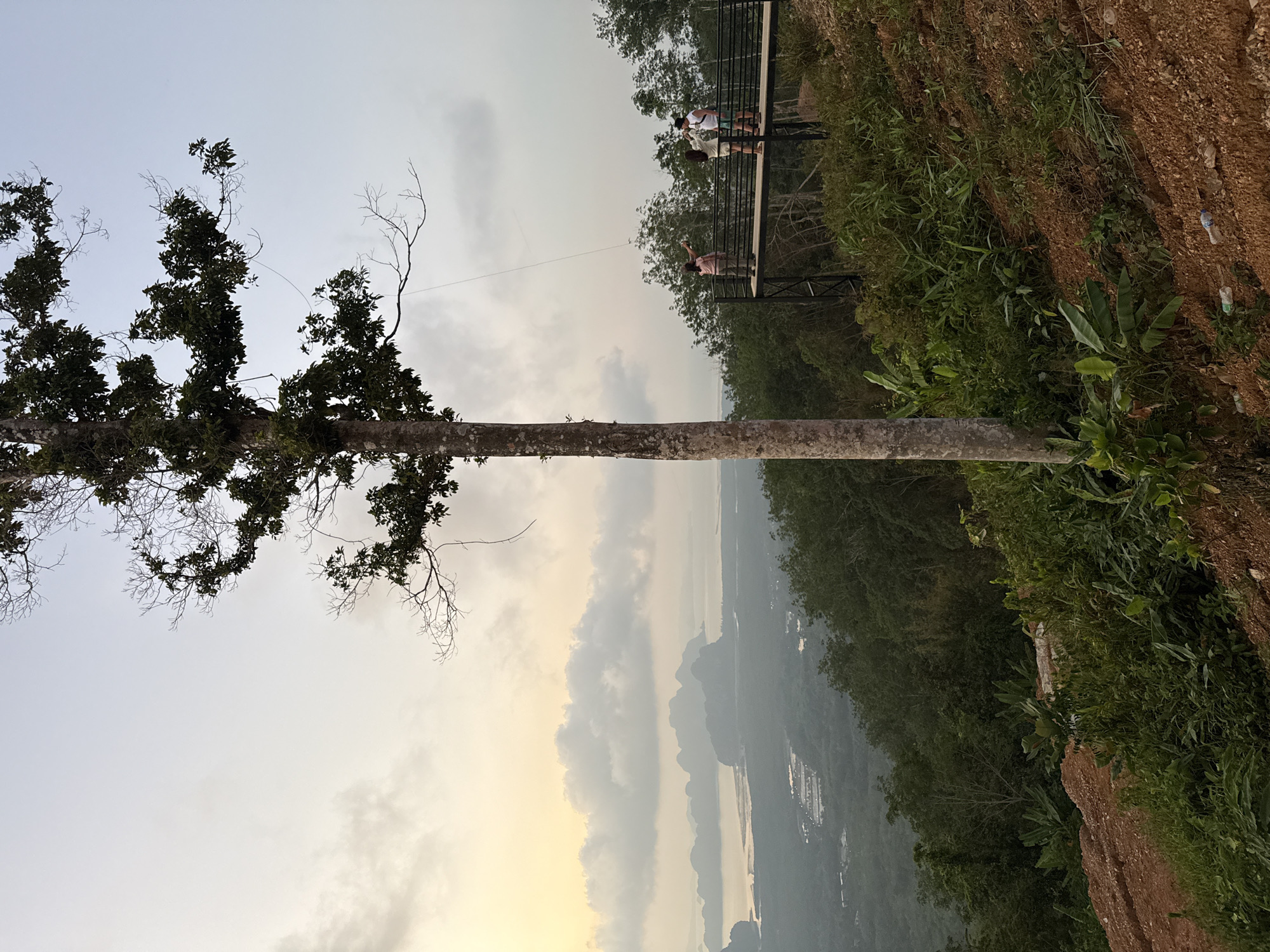 The image depicts a horizontal tree trunk in the foreground with leaves on the left end. A rope extends from a bare branch of the tree towards a viewing platform in the middle ground. On the platform, several people are standing. In the background, there is a mountainous landscape with a river or bay visible. The scene is set in Ban Khlong Khian, Thailand, as indicated by the location information. The right side of the image shows a grassy hill or slope. The sky is overcast.