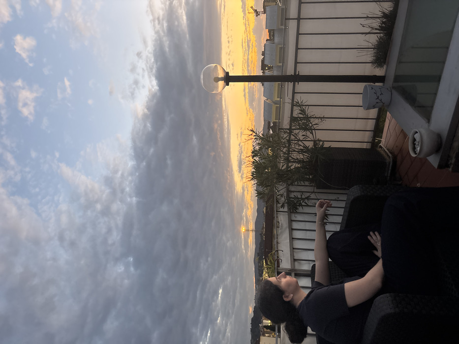 An image captures a female individual seated on a rooftop terrace at dusk in Florence, Italy