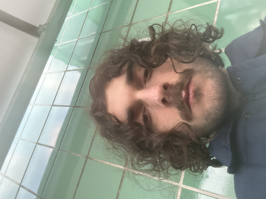 A selfie captures a man with curly, dark hair and a beard, seemingly indoors. His face is turned slightly towards the camera, with a neutral expression. He's wearing a dark blue shirt or jacket. The background is a wall tiled with light green, shiny tiles, providing a cool, reflective surface. The image is slightly angled, giving a casual and intimate feel.