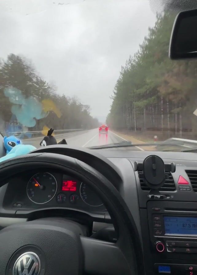 A first-person view from inside a car driving on a wet road. Rain is visible on the windshield, which is being cleared by windshield wipers. The car's dashboard is visible, showing the steering wheel, speedometer, radio, and other controls. There are several small toys hanging from the rearview mirror. A red car is driving ahead. The environment outside the car consists of trees lining the sides of the road. The sky is overcast and grey. The car appears to be moving at a moderate speed.