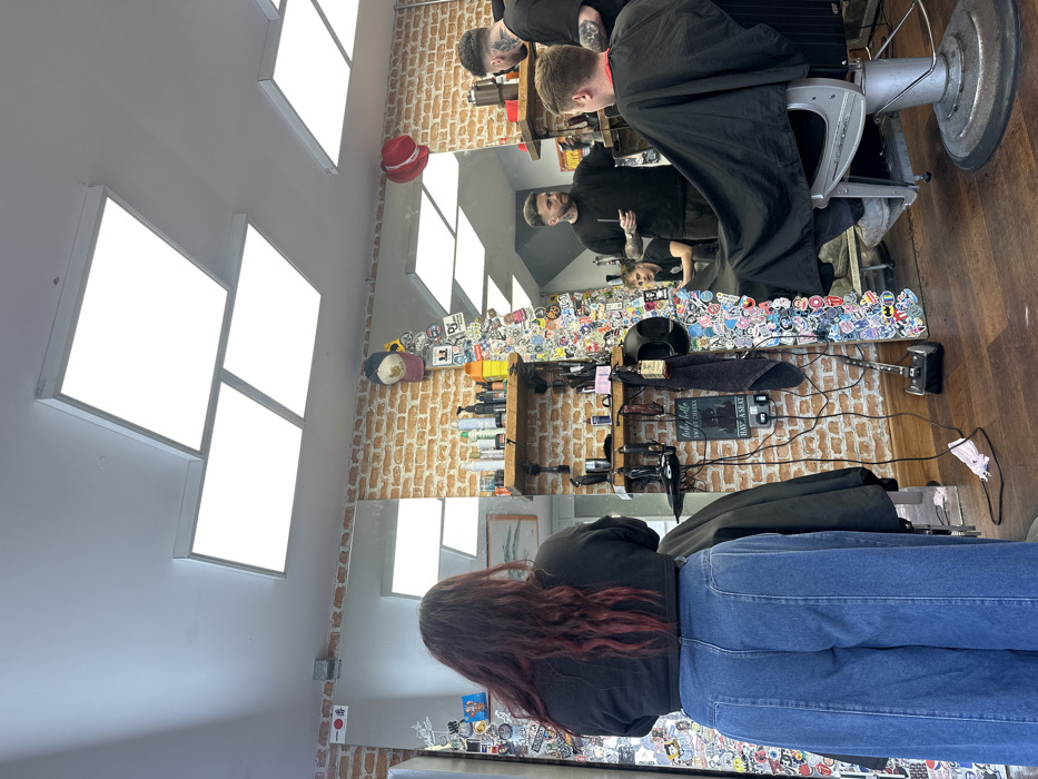 The image depicts the interior of a barbershop, identified as being located in Salisbury, United Kingdom. The scene features a well-lit space with a white ceiling containing multiple large, rectangular LED panel lights. The walls are partially covered with exposed brickwork, above which are smoother, lighter-colored sections. A significant portion of one wall and a large mirror frame are extensively decorated with numerous colorful stickers. The floor is dark wood. In the foreground, a person with long, dark, wavy hair with red undertones is seen from behind, wearing a black long-sleeved top and wide-leg blue denim jeans. They are seated in a black barber chair, mostly obscured by a black cape. Reflected in the large wall mirror to the right, a male barber with dark hair, a beard, and visible neck and arm tattoos is observed standing. He wears a black t-shirt and holds a black tool, appearing to attend to a male client seated in a barber chair. The client has short, light-colored hair and is also draped in a black cape. To the left of this primary interaction, another male individual with short light hair and a black t-shirt is partially visible in the reflection, seated or leaning. Further to the right in the reflection, another male barber or staff member is partially visible, also in a black t-shirt. Along the brick wall, above the mirror's lower edge, are two wooden shelves displaying various hair products in bottles and jars. Below these shelves, barber tools such as clippers and a hair dryer are mounted on the wall. A black motorcycle helmet rests on a lower shelf or counter. Visible electrical cords extend from wall sockets to various appliances. On the floor in the foreground, near the center, a small black stick-style vacuum cleaner and a white medical face mask are present. A framed sign reading "hello sweet cheeks HAVE A SEAT" is affixed to the brick wall.