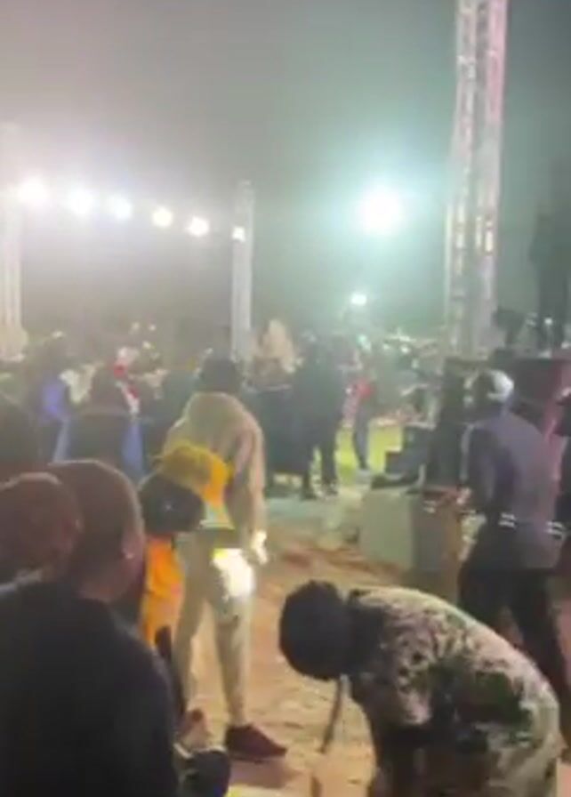 crowded outdoor concert at night. People are standing and dancing in front of a stage, which is lit up with bright white and colored lights. A few figures are visible on the stage. The scene is somewhat hazy from stage effects. There are vertical metal structures near the front of the crowd, presumably for lighting or sound equipment.