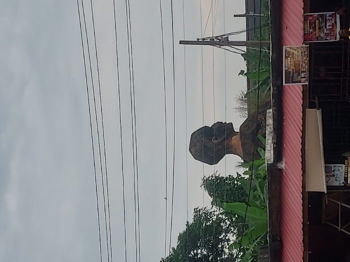 This image depicts an urban scene in Onitsha, Nigeria, under an overcast sky. A large, weathered bust statue of a human figure, facing right in profile, is prominently featured in the midground. The statue, appearing to be constructed from concrete or stone, exhibits a dark, discolored surface indicative of prolonged exposure to elements. Its lower portion is partially obscured by dense green foliage, consistent with banana plants, growing on a structure below. In the foreground, the upper section of a building is visible, characterized by a bright red corrugated metal roof. Below the roofline, several commercial signs and posters are affixed to the building's facade. One visible sign on the left reads "G.I.T.FASH.COM," while another on the right advertises "GLOBE EVENTS." The background is dominated by a light grey, cloudy sky. Multiple dark power lines stretch horizontally across the upper half of the frame. A single utility pole, dark and slender, stands on the far right, supporting additional wiring. A small, dark bird is perched on one of the power lines towards the center of the image. No discernible human activity or interactions are present.