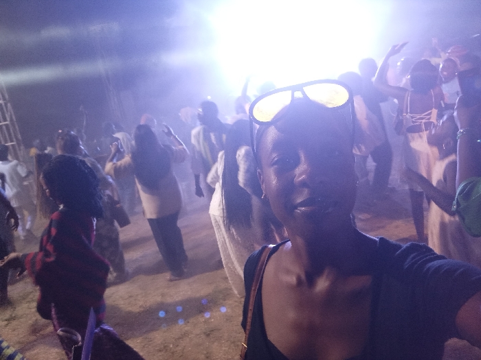 A woman takes a selfie in a dimly lit, crowded outdoor party. Her sunglasses rest on her head. The background is filled with people dancing, most dressed in white. A bright light shines from above, creating a hazy atmosphere. A ladder structure is visible on the left. The foreground has scattered blue light spots. The woman wears a dark-colored top and a cross-body bag.