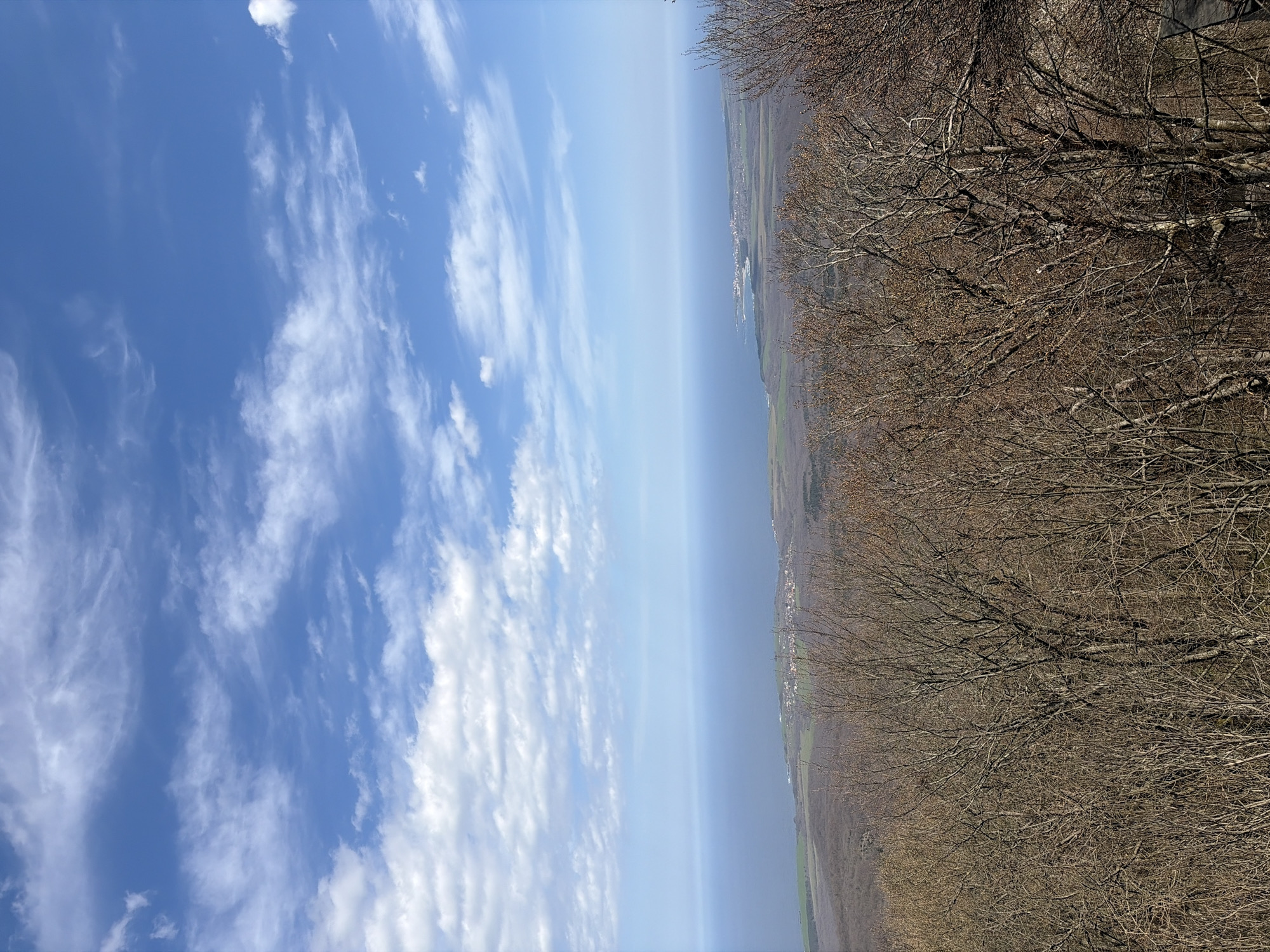 The image is a landscape, likely taken from a high vantage point, possibly a cliff or a hill, overlooking a town and the sea. The sky occupies a significant portion of the left side, displaying a bright blue hue with scattered white clouds. A body of water, possibly the Black Sea, is visible in the middle, appearing hazy and somewhat muted in color. On the right, a dense forest composed of bare trees without leaves dominates the scene. Further in the distance, a town with clustered buildings can be discerned, nestled between the forest and the water. This location may be the city of Brodilovo, Bulgaria, as it is located near the coast and surrounded by forests. There are no people visible in the image.