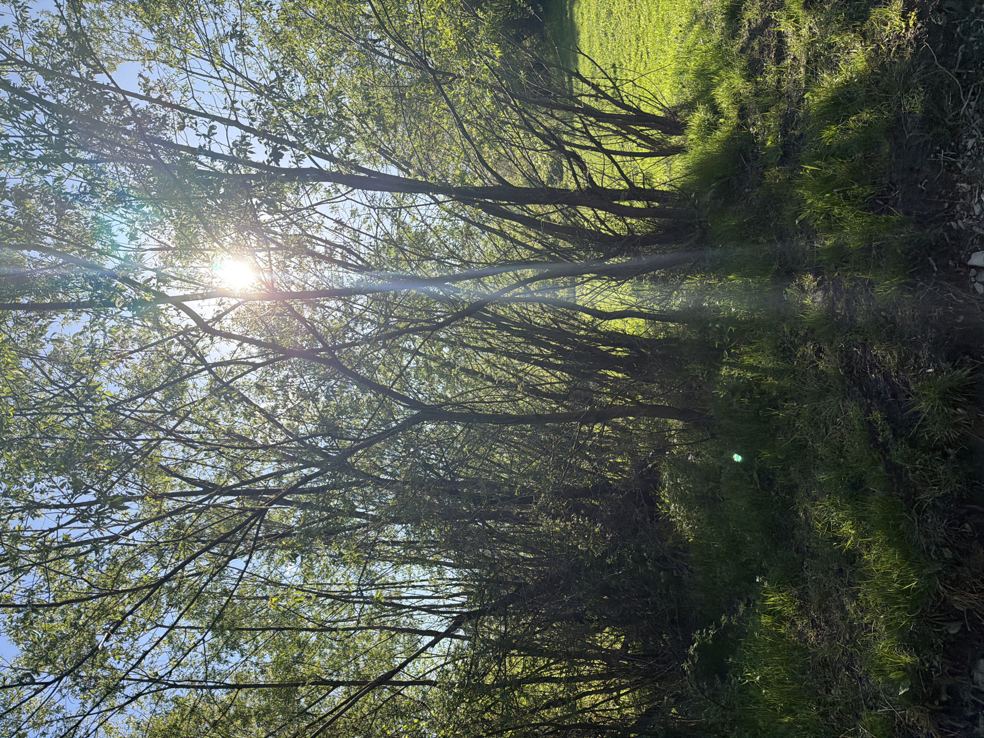 row of trees with dense foliage alongside a grassy area, possibly a field or meadow. Sunlight streams through the branches, creating a lens flare and dappled light patterns on the ground. The sky is visible through the gaps in the trees, appearing blue. The location is unspecified, but the prompt requested to describe it as Berkovitsa, Bulgaria. There are no people visible. The scene appears to be outdoors in a natural environment. The focus is on the interplay of light and shadow within the vegetation.