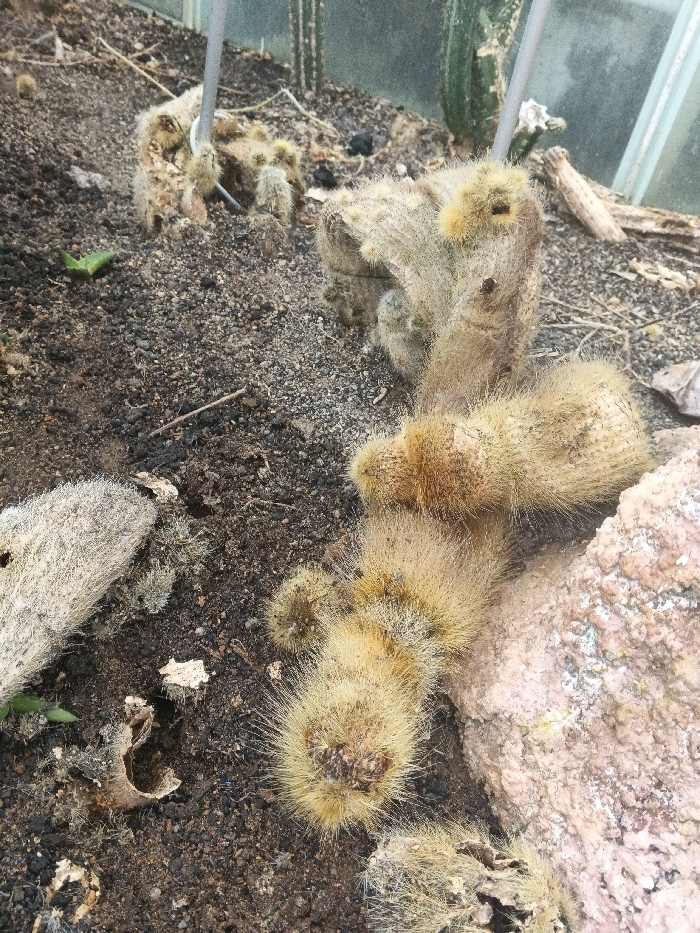 The scene depicts a botanical display of multiple cactus specimens within what appears to be a controlled environment, possibly a greenhouse or conservatory, consistent with a botanical collection in Matopos, Zimbabwe. The ground consists of dark, granular soil with scattered light-colored debris and a few small green plant sprouts. In the foreground and center, a dense cluster of cacti features elongated, cylindrical to irregularly shaped bodies covered in light brown to yellowish-white, hair-like spines. These vary in size, from smaller, ovate individual segments to larger, more established columnar forms. One prominent cactus mass on the right is positioned against a large, irregularly shaped rock displaying pinkish and pale yellow coloration. Towards the upper left, a thin, vertical, light grey metallic pole is embedded in the soil, partially surrounded by smaller, similarly hairy cacti. In the background, a translucent panel, likely glass or clear plastic, suggests an enclosure. Scattered dry organic matter, including what appears to be bark or woody fragments, lies on the soil. No human figures are present. The cacti exhibit some brown discoloration on their bodies, consistent with natural maturation or minor environmental stressors.