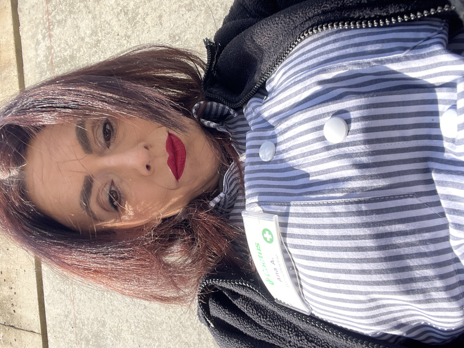 The image displays a close-up, chest-up portrait of a woman with auburn hair and red lipstick, looking directly forward. She is wearing a black zippered fleece jacket over a white and dark grey vertically striped shirt. The shirt features a ruffled collar and large, round white buttons down the front. A clear plastic name tag is affixed to her left chest, displaying the "Cactus" logo, "Ana A.", and the designation "Caissière," along with a green cross symbol. The background is a plain, light-colored concrete wall, illuminated by bright sunlight. The subject is an individual likely employed by a Cactus supermarket, potentially located in Mensdorf, Luxembourg.