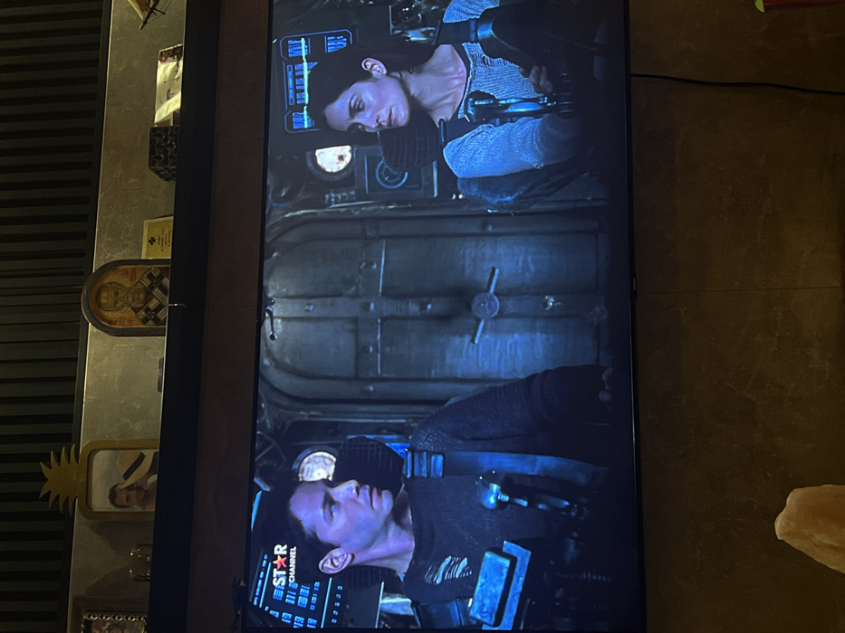 television screen playing a scene from a movie. Two characters are visible: a woman holding a gun, positioned at the top, and a man at the bottom, both seemingly in some kind of underwater or industrial setting. A large metal door with a wheel mechanism dominates the center of the screen. The "STAR CHANNEL" logo is visible in the lower left corner. To the left of the screen are a series of decorative objects arranged vertically on a wall, including a picture with a portrait, an icon, and possibly a boat model.