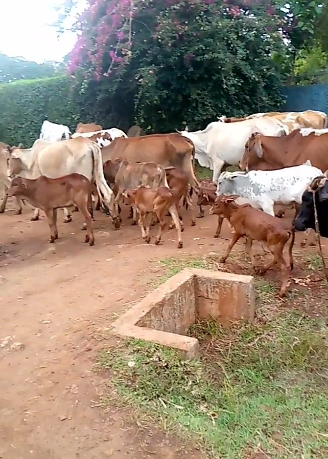 A collection of brown, white, and black cattle stand in a cluster on a dirt path next to a concrete water trough. A calf kicks its legs out playfully toward the camera. Green foliage and pink bougainvillea blossoms are visible in the background. The camera moves slightly, revealing more of the herd and the path.