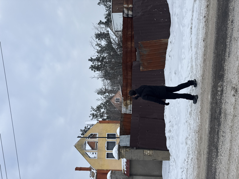 A man in black walks along a snow-covered road next to a rusted corrugated metal fence. Behind the fence, houses are visible, including a yellow building with boarded-up windows. Bare trees stand between the houses. The sky is overcast. Electrical lines stretch across the upper left corner. The photograph appears to be taken in a rural or suburban setting, with signs of damage or disrepair in the architecture.
