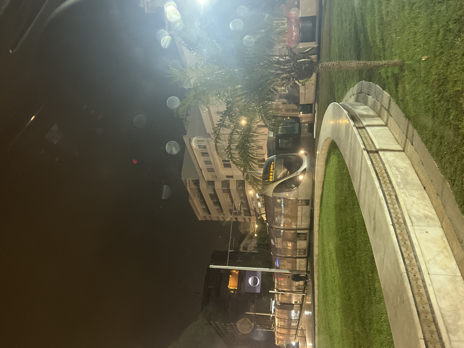 - "At night, a sleek, modern tram sits beside a green space framed by a curved, decorative concrete wall" by FM-jNNUn2, licensed under CC BY 4.0