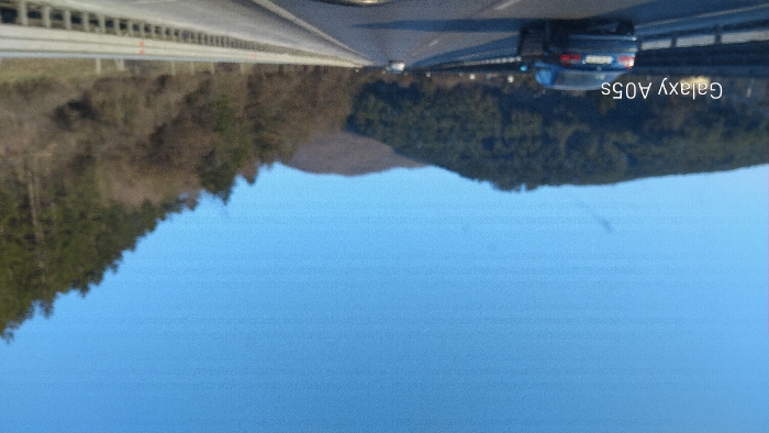 The image depicts a multi-lane highway, presumably near Churek, Bulgaria, observed during daylight under a clear blue sky. The highway features asphalt pavement with visible white lane markings and silver metal guardrails on both sides. To the left, a densely forested mountain or large hill is present. To the right, another mountain or hill displays a mix of evergreen trees and deciduous trees or shrubs with bare branches. In the left lane of the highway, a dark blue sedan, appearing to be a BMW, travels away from the viewer. Its rear is visible, including taillights and a partially obscured license plate. Further down the right lane, a lighter-colored sedan is also moving away. The photograph is taken from inside a vehicle, with a portion of the dashboard or windshield reflection visible at the bottom center. A digital watermark "Galaxy A05s" is overlaid in the lower-left quadrant. No individuals are discernible.