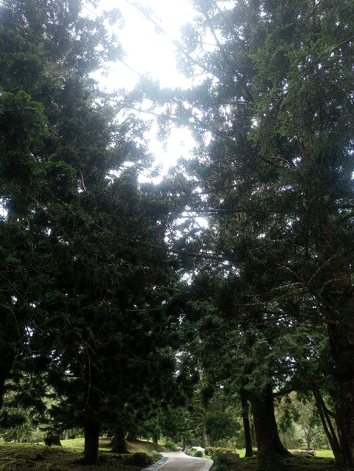 The image displays a forested landscape located in the city of Padegaon, India. A light-colored, paved path with a dark border on its left edge curves from the lower-left foreground towards the center-right background, disappearing into the distance. The path is flanked by uneven terrain covered in green grass and moss. Numerous tall, dense evergreen trees with dark green foliage dominate the scene, forming a thick canopy overhead. Bright, diffuse daylight is visible through gaps in the tree branches in the upper portion of the frame. Tree trunks are visible on either side of the path. No individuals, animals, or specific actions are discernible within the frame.