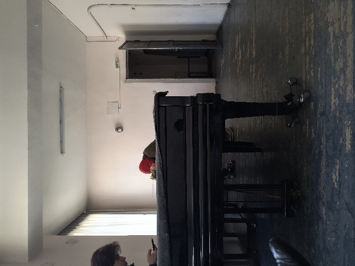 The image portrays an indoor scene within a utilitarian room in Razgrad, Bulgaria. A large, black grand piano, with a dark cover draped over part of its surface, dominates the mid-ground. In the left foreground, a person with curly brown hair, wearing a dark garment, is engrossed in a black smartphone held horizontally. Behind the piano, a second individual, dressed in a dark olive-green jacket and a red head covering, stands with their head bowed towards a multi-colored bouquet of flowers (pink, red, and light hues) placed on the piano. The room features pale pink/beige walls and a white ceiling with exposed beams and a single fluorescent light fixture. A large window with white sheer curtains is visible on the left wall, admitting natural light. The floor consists of dark wooden planks, heavily worn with patches of lighter, exposed wood. On the right wall, an open dark wooden door leads to an unlit area. Above the open door, a green sign bearing the Cyrillic word 'ИЗХОД' (Exit) is mounted. White electrical conduit is affixed to the upper right wall, and a small, square white panel along with a cylindrical fixture are mounted on the wall to the left of the door.